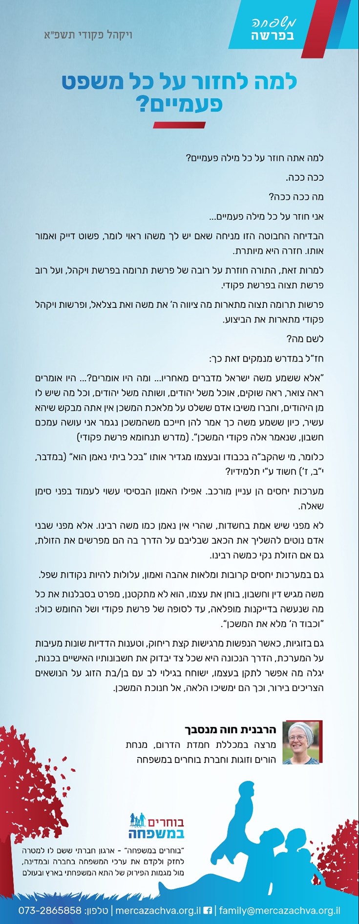 גם בזוגיות, כאשר הנפשות מרגישות קצת ריחוק, וטענות הדדיות שונות מעיבות על המערכת, הדרך הנכונה היא שכל צד יבדוק את חשבונותיו האישיים בכנות, יגלה מה אפשר לתקן בעצמו, ישוחח בגילוי לב עם בן/בת הזוג על הנושאים הצריכים בירור, וכך הם ימשיכו הלאה, אל חנוכת המשכן.